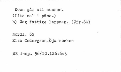 //// Koen går uti mossen. (Lite mal i påse.) b) ffag fattige lappman. (Jfr.61*) //// Nordl. 62 //// Elsa Cedergren,Öja socken SR insp. 56/10.126:6-.3 ////