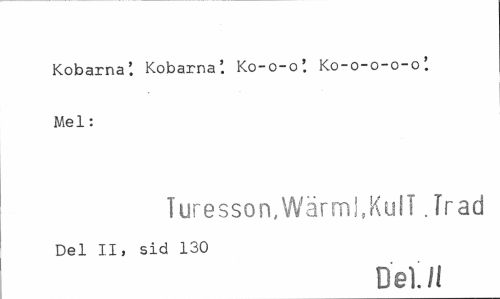 //// Kobarna'. Kobarna'. Ko-o-o'. Ko-o-o-o-o'. Mel: //// Turesson,Wärml,Kull. Trad //// Del II, sid 130 //// Del! Il ////