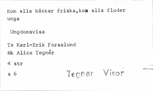//// Kom alla bäckar friska,kora alla floder unga //// Ungdomsvisa //// Tx Karl-Erik Forsslund Mk Alice Tegnér //// 4 str //// s e Tecfiér Visor ////
