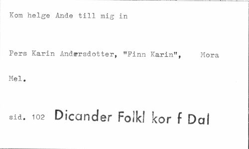 //// Kom helge Ande till mig in //// Pers Karin Andprsdotter, "Finn Karin", Mora Mel. //// sid. 102 Dicander Folk! kor f Dal ////