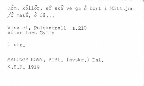 //// Rom, kollor, so ska ve ga o bort i Hättsjön //// .a *> ro //// /o meta, o fa... //// Visa el, Polskatrall s.210 efter Lars Gylin //// 1 str. //// MALUNGS KOMM. BIBL. (avskr.) Dal. K.E.F. 1919 ////