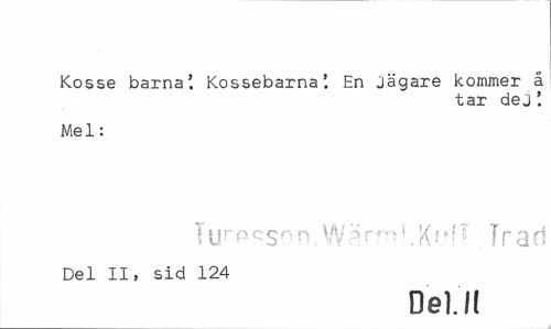 //// Kosse barna'. Kossebarna'. En jägare kommer å //// tar dej'. //// Mel: //// I"yrpq5nn.W3rrrt'fKu|T jp3rj //// Del II, sid 124 //// Del. I! ////