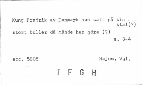 //// Kung Fredrik av Danmark han satt på sin //// stal(?) //// stort buller dä mande han göra (?) //// s. 3-4 //// acc. 5805 Hajom, Vgl. //// i f g h ////