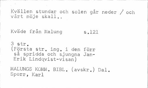//// Kvällen stundar och solen går neder / och vårt nöje skall.. //// Kväde från Malung s.121 //// 3 str. //// (Första str. ing. i den förr så spridda och sjungna Jan-Erik Lindqvist-visan) //// MALUNGS KOMM. BIBL. (avskr.) Dal. Sporr, Karl ////