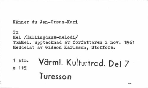 //// Känner du Jan-Orsas-Kari Tx //// Mel /Hallingdans*-melodi/ //// Tx&Mel. upptecknad av författaren i nov. ti$6l Meddelat av G-ideon Karlsson, Storfors* //// 1 str- Värml. Kultxtrcd. Del 7 //// s 1 T5- //// Turesson ////