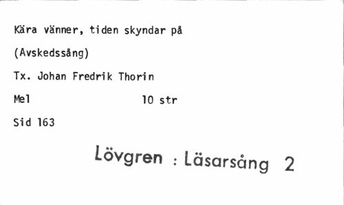 //// Kära vänner, tiden skyndar på //// (Avskedssång) //// Tx. Johan Fredrik Thorin //// Mel 10 str //// Sid 163 //// Lövgren : Läsarsång 2 ////