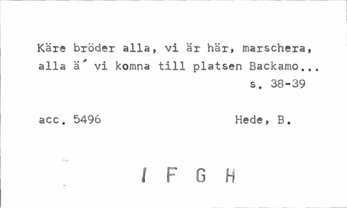//// Käre bröder alla, vi är här, marschera, alla ä' vi komna till platsen Backamo... //// s. 38-39 //// acc. 5496 Hede, B. //// / F G H ////