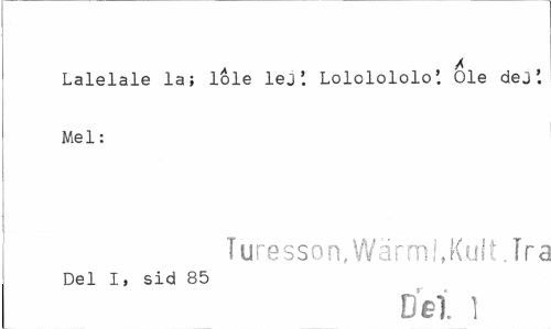 //// x A //// Lalelale la; lole lej'. Lololololo'. Ole dej'. Mel: //// I u r e s s o n, W ärml, Kult.Tre //// Del I, sid 85 //// Del 1 ////
