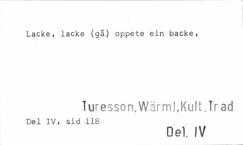 //// Lacke, lacke (gå) oppete ein backe, //// Turesson,Wärm!,Kult.Trad //// Del IV, sid 118 //// Del. IV ////
