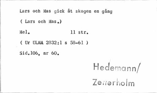 //// Lars och Mas gick åt skogen en gång C Lars och Mas.) Mel. 11 str. //// ( Ur ULMA 2832jl s 58-61 ) Sid.106, nr 60. //// Hedemcmn/ //// Ze^arholm ////