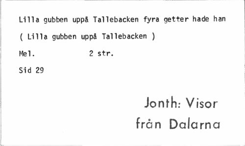 //// Lilla gubben uppå Tallebacken fyra getter hade han ( Lilla gubben uppå Tallebacken ) Mel. 2 str. //// Sid 29 //// Jonth; Visor från Dalarna ////