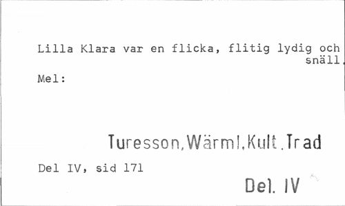 //// Lilla Klara var en flicka, flitig lydig och //// snäll //// Mel: //// Turesson, Wärm I. Kult. Tr ad //// Del IV, sid 171 //// Del. IV ////
