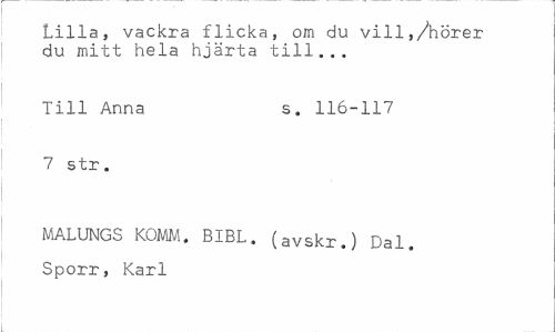 //// Lilla, vackra flicka, om du vill,/hörer du mitt hela hjärta till... //// Till Anna s. 116-117 //// 7 str. //// MALUNGS KOMM. BIBL. (avskr.) Dal. Sporr, Karl ////