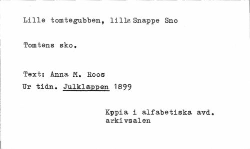 //// Lille tomtegubben, lillaSnappe Sno Tomtens sko. //// Text: Anna M. Eoos Ur tidn. Julklappen 1899 //// Kppia i alfabetiska avd. arkivsalen ////