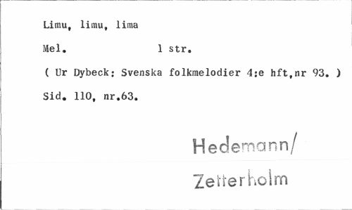 //// Limu, limu, lima //// Mel. 1 str. //// ( Ur Dybeck; Svenska folkmelodier 4:e hft.nr 93. ) Sid. 110, nr.63. //// Hedemcmn/ Zetterholm ////
