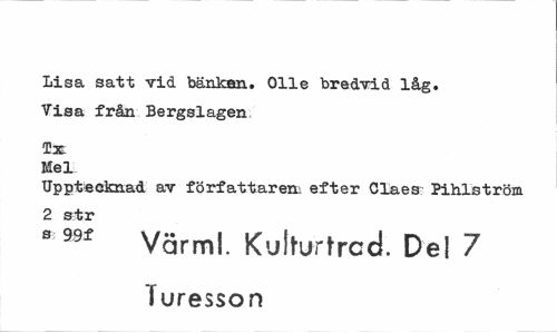 //// Lisa satt vid bänkan, Olle bredvid låg. Visa från Bergslagen //// 2b£ Mel //// Upptecknad av författarem efter Claes Pihlström 2 str //// s 99f Värml. Kulhjrtrad. Del 7 //// Turesson ////