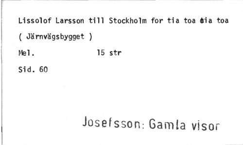 //// Lissolof Larsson till Stockholm for tia toa dria toa //// ( Järnvägsbygget ) //// Mel. 15 str //// Sid. 60 //// Josefsson: Gamla visor ////