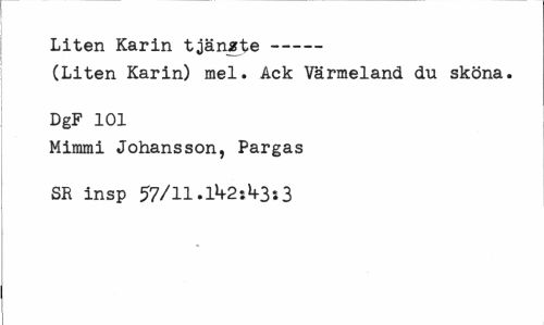 //// Liten Karin tjänarte--- //// (Liten Karin) mel. Ack Värmeland du sköna. //// DgF 101 //// Mimmi Johansson, Pargas SR insp 57/11.1^2:^3:3 ////