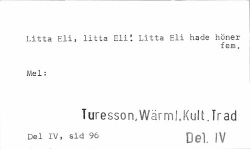 //// Litta Eli, litta Eli'. Litta Eli hade höner //// fem. //// Mel: //// Turesson, Wärml. Kult. Trad //// Del IV, sid 96 Q|y ////