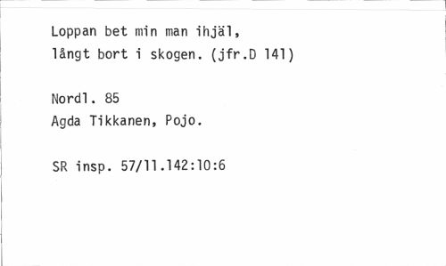 //// Loppan bet min man ihjäl, långt bort i skogen. (jfr.D 141) //// Nordl. 85 //// Agda Tikkanen, Pojo. SR insp. 57/11.142:10:6 ////