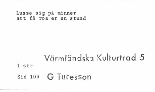 //// Lusse sig på minner att få roa er en stund //// Värmländska Kulturtrad 5 //// 1 str //// sid 103 G Turesson ////