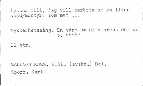 //// Lyssna till, jag vill berätta om en liten späd/martyr, som med ... //// Nykterhetssång. En sång om drinkarens dotter //// s. 66-67 //// 11 str. //// MALUNGS KOMM. BIBL. (avskr.) Dal. Sporr, Karl ////