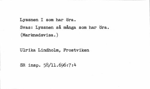 //// Lyssnen I som har öra. //// Svas: Lyssnen så många som har öra. //// (Marknadsvisa.) //// Ulrika Lindholm, Prostviken //// SR insp. 58/11.696:7:4 ////