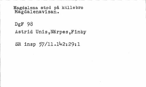 //// Magdalena stod på källebro Magdalenavisan. //// DgF 98 //// Astrid Unis,Närpes,Finby SR insp 57/11.1^2:29:1 ////
