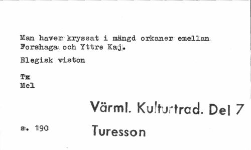 //// Man haver: kryssat i mängd orkaner emellan Forshaga? och Yttre Kaj. //// Elegisk viston //// Ta //// Mel //// Värml. Ku!turtrad. Del 7 s- t9° Turesson ////