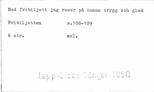 //// Med fribiljett jag reser på banan trygg och glad Fribiljetten s.108-109 //// 6 str. mel. //// Lapp-Lisas Sånger 1950 ////