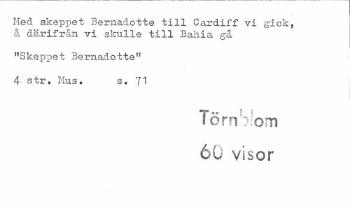 //// Med skeppet Bernadotte till Cardiff vi gick, å därifrån vi skulle till Bahia gå //// "Skeppet Bernadotte" //// 4 str. Mus. s. 71 //// T" I 1 //// f orn )'om 60 visor ////