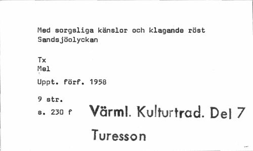 //// Med sorgsliga känslor och klagande röst Sandsjöolyckan //// Tx Hel //// Uppt. förf. 1958 9 str. //// s. 230 f Värml. Kulturtrad. Del 7 Turesson ////