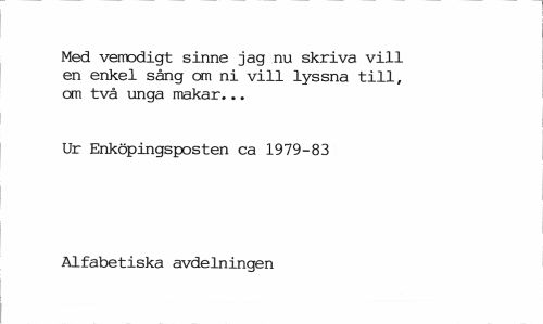 //// Med vemodigt sinne jag nu skriva vill en enkel sång cm ni vill lyssna till, cm två unga makar... //// Ur Enköpingsposten ca 1979-83 Alfabetiska avdelningen ////