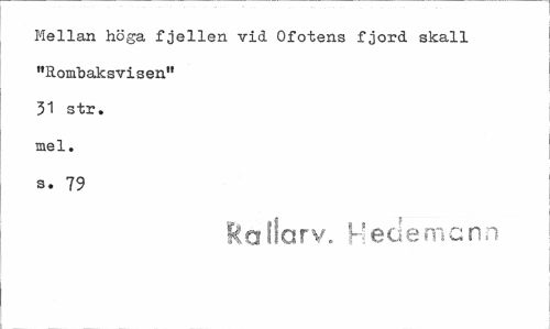 //// Mellan höga fjellen vid Ofotens fjord skall //// "Rombaksvisen" //// 31 str. //// mel. //// s. 79 //// Rallarv. Feclemcnn ////