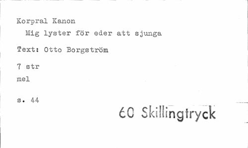 //// Korpral Kanon //// Mig lyster för eder att sjunga //// Text; Otto Borgström //// 7 str mel //// s. 44 //// 60 Skillingtryck ////