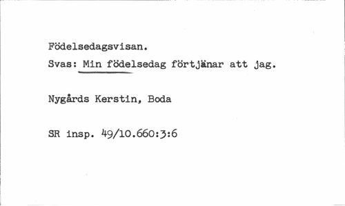 //// Födelsedagsvisan. //// Svas: Min födelsedag förtjänar att jag. Nygårds Kerstin, Boda SR insp. 49/10.660:3:6 ////