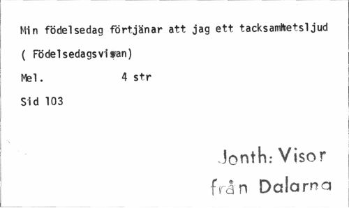 //// Min födelsedag förtjänar att jag ett tacksamHretsl jud ( Födelsedagsvi tan) Mel. 4 str //// Sid 103 //// Jonth: Visor //// från Dalarna ////