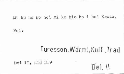 //// Mi ko ho ho ho'. Mi ko hio ho i ho'. Krusa, Mel: //// Tures son.Wärml.KulT .Träd //// Del II, sid 219 . ¦ //// Del. \l ////