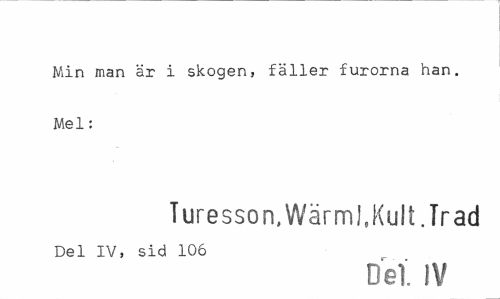 //// Min inan är i skogen, fäller furorna han. Mel: //// Turesson, Wärml,Kult.Trad //// Del IV, sid 106 //// Del. IV ////