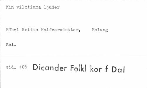 //// Min vilotimma ljuder //// Päbel Britta Halfvarsdotter, Malung Mel. //// sid. 106 Dicander Folkl kor f Dal ////