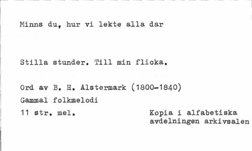 //// Minns du, hur vi lekte alla dar //// Stilla stunder. Till min flicka. //// Ord av B. H. Alstermark (1800-1840) Gammal folkmelodi //// 11 str. mel. Kopia i alfabetiska //// avdelningen arkivsalen ////