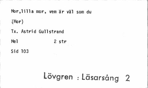 //// Mor ,1 i Ila mor, vem är väl som du {Mor) //// Tx. Astrid Gul1 strand Mel 2 str //// Sid 103 //// Lövgren : Läsarsång 2 ////