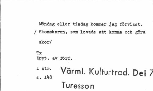 //// Måndag eller tisdag kommer jag förvisst. / Skomakaren, som lovade att komma och göra //// skor/ //// Tx //// Uppt. av förf. //// 1 str' Värml. Kulturtrad. Del ; //// s. 1U8 //// Turesson ////
