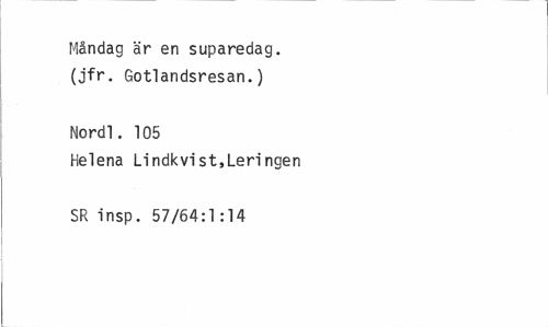 //// Måndag är en suparedag. (jfr. Gotlandsresan.) //// Nordl. 105 //// Helena Lindkvist,Leringen SR insp. 57/64:1:14 ////