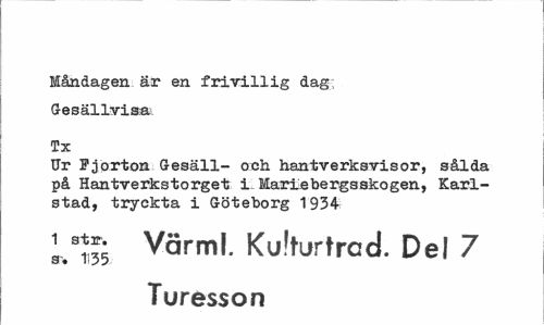 //// Måndagen är en frivillig dag Gesällvisa //// Tx //// Ur Fjorton Gesäll- och hantverksvisor, sålda på Hantverkstorget i Mariebergsskogen, Karlstad, tryckta i Göteborg 1934 //// I"* Värml. Kulturtrcd. Del 7 Turesson ////
