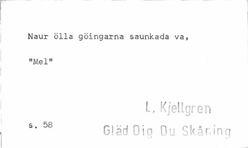 //// Naur ölla göingarna saunkada va, "Mel" //// L, Kjell gren //// s' 58 Gläd D i o O u S k å n i n n ////