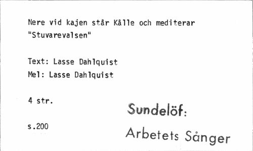 //// Nere vid kajen står Kålle och mediterar "Stuvarevalsen" //// Text: Lasse Dahlquist Mel: Lasse Dahlquist //// Sundelöf: //// s.200 A i //// Arbetets Sånger ////