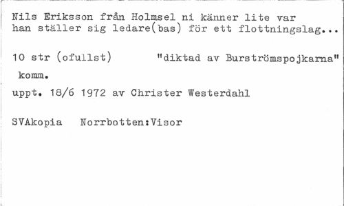 //// Nils Eriksson frän Holmsel ni känner lite var //// han ställer sig ledare(bas) för ett flottningslag... //// 10 str (ofullst) "diktad av Burströmspojkarna" //// komm. //// uppt. 18/6 1972 av Christer Westerdahl SVAkopia Norrbotten:Visor ////