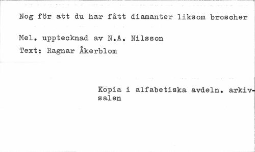 //// Nog för att du har fått diamanter liksom broscher //// Mel. upptecknad av N.A, Nilsson Text: Ragnar Åkerblom //// Kopia i alfabetiska avdeln. arkiv salen ////