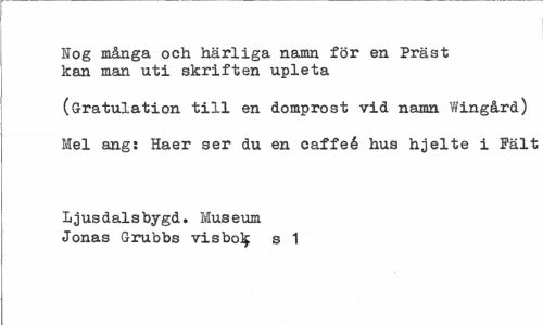 //// Nog många och härliga namn för en Präst kan man uti skriften upleta //// (Gratulation till en domprost vid namn Wingård) Mel ang: Haer ser du en caffeé hus hjelte i Fält //// Ljusdalsbygd. Museum Jonas Grubbs visbolf s 1 ////